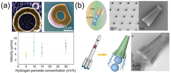 Remmi et al. used TPP to fabricate multi-responsive artificial microswimmers []. Doughnut-like swimmers were fabricated and coated with platinum catalytic layers so that they could be actuated by chemical power. In water, the tori exhibited pure Brownian diffusion. However, in the presence of hydrogen peroxide, the 7 μm doughnut consumed the fuel and directionally translated across the surface. The propulsion velocity of the tori scaled linearly with the concentration (v/v%) of hydrogen peroxide up to 10% and then saturated from 10% to 30% (Figure 7a). In 30% hydrogen peroxide, the doughnut swam with a speed of about 7 μm/s. Such shape-programmed microswimmers have the potential to manipulate biologically active matter such as bacteria or cells.