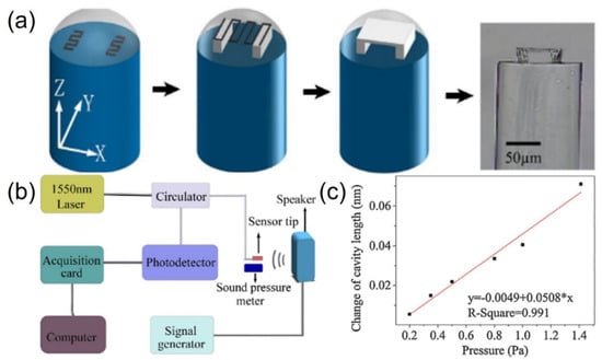 Actuators which can transfer acoustic waves to mechanical movement, resulting in (a) actuators made by TPP on fiber. (b) Schematic diagram of experimental setup for acoustic pressure measurement. (c) The measured relationship between the change in cavity length and the acoustic pressure at 1 kHz. Reproduced with permission from [], Copyright © 2017 Elsevier.