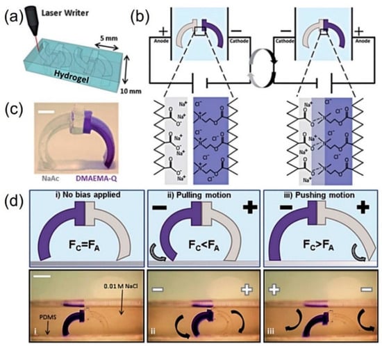 Electric-driven hydrogel actuators. (a) Laser cutting process. (b) Actuation mechanism of the hydrogel actuators. (c) Photograph of a finished gel walker. Scale bar: 2.5 mm. (d) Illustrations and photographs of a gel walker composed of NaAAc and 30% DMAEMA-Q legs in 0.01 M NaCl with an applied field of 5 V/cm. Reproduced with permission from []. Copyright © 2014, Royal Society of Chemistry.