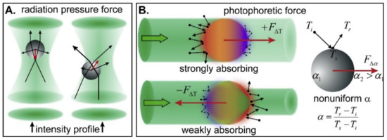 (A) A ray-optics description of the radiation-pressure force on a transparent sphere. (B) The photophoretic forces include the ΔT-force and the Δα-force. The inhomogeneous heating on strongly and weakly absorbing spheres results in positive and negative ΔT -forces. The Δα-force can exist in a particle with non-uniform thermal accommodation coefficient α, even when the particle has a uniform temperature (reprinted from [56] with permission from Elsevier, Copyright (2018) Elsevier).