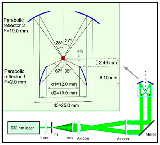 Schematic of the optical trapping apparatus with the detailed alignments and dimensions of the two focusing parabolic reflectors. (Reprinted with permission from [50] under Open Access License. Copyright (2019) The Optical Society of America).