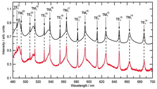 Thompson and co-workers [184] studied fluorescence spectra of dye-doped bisphere (made of beads of equal diameters) and they demonstrated coherent coupling of axial modes, by making separation-sensitive measurements where observed MDRs’ mode splitting decreased when the spacing between the individual beads increased. However, no splitting was observed for particles of disproportionate diameters with no wavelength overlap between widths of MDRs in their spectra, resulting in negligible coupling regardless of the spacing.