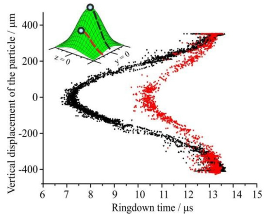 Sensitivity of the measured RDT to the position of a 1 µm radius particle within the CRDS beam. The change in RDT time with vertical position is recorded for a particle passing through the center of the beam (black symbols) and ~200 µm off-center (red symbols) (reprinted with permission from [137]. Copyright (2013) American Chemical Society).