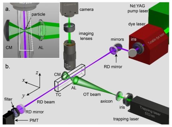 In 2015, Wang et al. [138] demonstrated an optical trap-cavity ringdown (OT-CRDS) scope, enabling to view the changes of physical and chemical properties via light extinction measurements, in addition to routine size, motion, and restoring forces, that was estimated as small as ~10−10 N/m. Two years later, the same group [139] improved their system with a more robust trapping scheme, based on confocal hollow beams, as shown in Figure 5. Scanning a monowall carbon nanotube across the CRDS beam yielded an extinction efficiency of Qext = 1.96 and the system was sensitive enough to distinguish the number of particles in the trap. By studying several kinds of aerosol particles (with similarities and differences) under various conditions, they showed the need for considering the compound effect of morphology and composition on the scattering and absorption components in the total extinction, in addition to the size-, material-, and wavelength dependence of optical extinction.