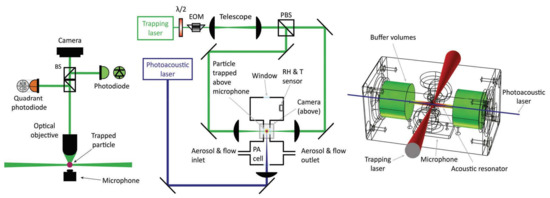 New designs allowing standard particle trapping inside a PA cell have been developed and an example of a scheme combining optical trapping and PA spectrometer is shown in Figure 6. Note that such setups require a stable trapping, strong enough to overcome photophoretic forces arising from unevenly heating the particle. Cremer and co-workers [143] performed photoacoustic measurements on single laser-trapped droplets and achieved a minimum detectable absorption coefficient of αmin = 0.0074 × 10−6 m−1.