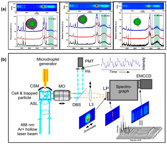 As shown in Figure 7, our group [39] combined position- and time-resolved Raman spectroscopy with optical trapping to demonstrate direct observation of phase separation within multicomponent droplets of diethylphtalate (DEP) and glycerol. Vertically resolved Raman sampling was performed through a narrow slit and scanning it across the droplet resulted in a complete position-resolved Raman scattering measurement, revealing a neat core-shell morphology with glycerol at the center, coated with a layer of DEP. Continuous measurement over time allowed to monitor the evaporation dynamics of an organic–organic mixed droplet, without the challenge of spectral overlap normally found in an averaged single measurement.