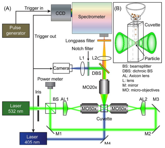 The experimental setup. (A) The OT-RS system based on two counter-propagating hollow beams for trapping and characterizing both absorbing and transparent particles. (B) The detailed particle introduction setup and the hollow optical trap. (Reprinted with permission from [181]. Copyright (2107) Elsevier).