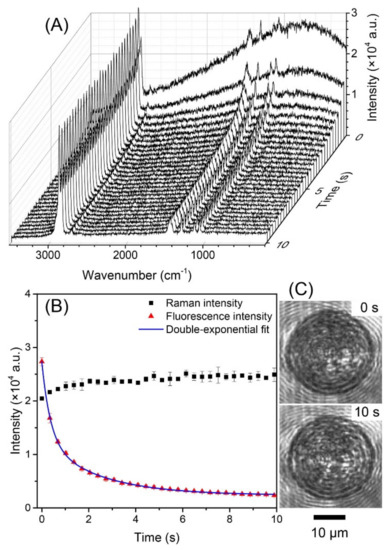 The evolution process from fluorescence to Raman spectra of a single strongly absorbing rhodamine-B-doped PE microsphere in the optical trap. (A) The time-resolved spectra in the first 10 s. (B) The fluorescence intensity (red triangles) was fitted to a double-exponential decay (blue solid line). The intensity of the Raman peak at ~2890 cm−1 (black squares) remained relatively constant. (C) Images of the trapped particle taken at 0 s and 10 s. (Reprinted with permission from [181]. Copyright (2107) Elsevier).