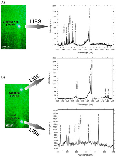 LIBS spectra of a non-homogeneous mixture from 50% graphite and 50% nickel spheres when (A) trapped particles are closely spaced in the same focal region and (B) trapped particles are properly manipulated and isolated from each other. The main emission lines are labeled in the spectra. (Reprinted with permission from [194]. Copyright (2014) Elsevier).