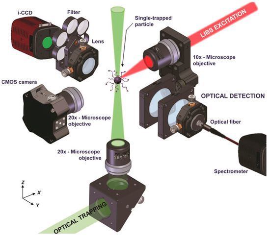 Prior to the incorporation of optical trapping into LIBS, Fortes et al. [192,193] demonstrated an optical catapulting-LIBS (OC-LIBS) system, where particles resting on a substrate are literally ejected into the air by a laser-induced shockwave from underneath, to get intercepted by a crossing pulsed probe beam. In comparison to conventional LIBS, this method has an advantage of higher sampling rate; however, its efficiency relies on the success of particle-LIBS beam interception, which in return depends on other characteristics such as the focusing of the catapulting beam, the material and thickness of the substrate, and the particle’s mass density [193]. An improved version combining OC-LIBS with optical trapping (OT) was first revealed in 2014, by the same group [194]. It consists in an arrangement of three lasers ensuring the main functions of the system: aerosolization (optical catapulting, Nd:YAG 1064 nm), particle trapping (Ar+ laser, 514.5 nm), and LIBS analysis (pulsed Nd:YAG 1064 nm). A 300 mJ pulse energy from Nd:YAG laser ensured complete breakdown of individual particles (nickel, graphite, and aluminum oxide) into plasma and the spectral analysis provided a detection efficiency of 100%. Another notable advantage of this system is the ability to, optically, separate particles inside the trap and analyze each individually (Figure 10)—a very useful approach for complex and mixed samples, like is always the case for atmospheric aerosols. An impressive sensitivity of 17 femtograms was achieved, considering that the limit of detection had been determined to be 200 attograms.