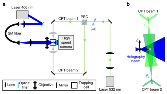 - Hayasaki, Y.; Sato, A. Holographic three-dimensional motion detection of an optically trapped sub-100 nm gold nanoparticle. Opt. Commun. 2014, 322, 22–26. [Google Scholar] [CrossRef]