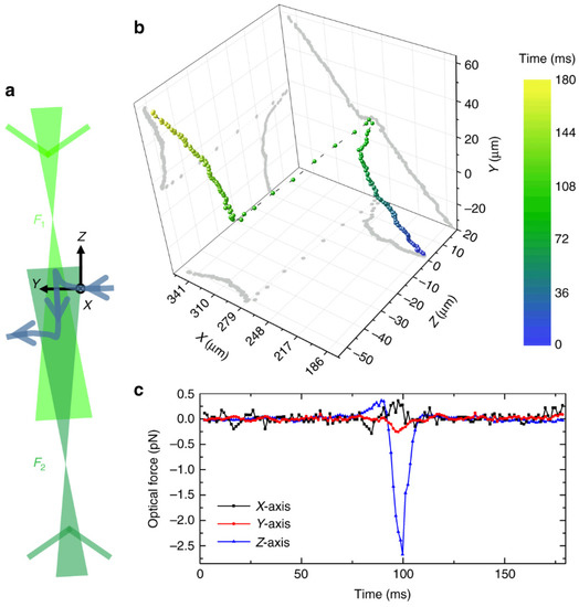 All forces, described in Figure 1, can act simultaneously on a particle. Their respective influences depend on the nature of the particle, the trapping beam configuration, and the trapping medium. For a homogeneous spherical particle, the three forces can be estimated as follow [56,57]: