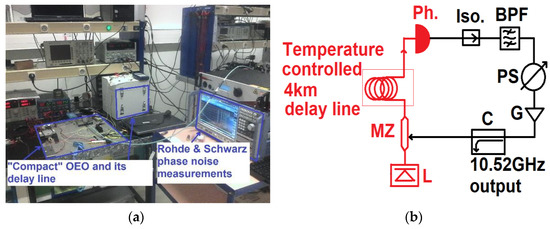 In this section, we describe the DUT to be characterized. This DUT was an OEO undergoing miniaturization. For miniaturization for this type of OEO, we aimed to place it in conditions where, in the long term, the oscillator could fit in a volume of one liter. One liter is typically the volume that an on-board oscillator should have [15]. If this oscillator had a delay line, this goal of miniaturization would be too ambitious. However, the compactness of the element comprising the delay lines could be achieved by packaging a coil of fiber, as is done for gyroscopes [16]. For the other building blocks of the delay line-based OEO, compactness was ensured with patient 3D work on the OEO by interweaving the various components like the laser, modulator, and amplifiers, and providing compact power supply boards. The procedure followed here in the laboratory was not focused on compactness at this stage of the study. The compactness led to other constraints, such as the need to control the sensitivity of electromagnetism (EMC), which, in the case of an OEO, would be less impacted thanks to the optical aspect of a large part of the oscillation loop. Amplifiers and electrical components, on the other hand, are sensitive to EMC. It was not necessary to control the optical fiber through temperature, nor the possible stabilization of the laser by a feedback loop [17].