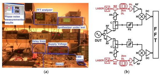(a) Photo of the phase noise measurement bench developed at the laboratory while measuring the phase noise of a synthesizer under test. (b) Schematic view of phase noise measurement bench system using a double optical delay line. Optical elements and electrical elements are respectively drawn in red and black colors. DUT—device under test; MZ—Mach–Zenher modulator; DL—delay line; Ph—photodetector; M—mixer; DC—DC amplifier; RF—microwave amplifier; Att.—attenuator; C—directive coupler; PS—phase shifter; FFT—fast Fourier transform analyzer.