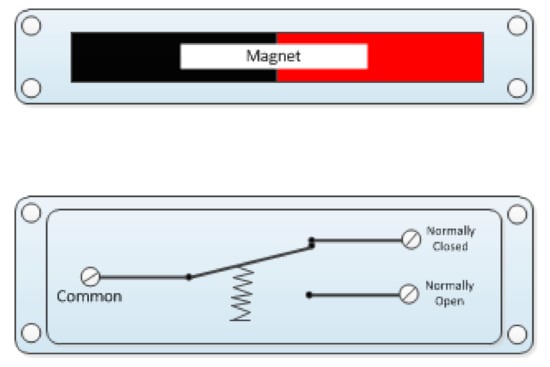 Magnetic contacts are used in almost every industry for various purposes, for example, to detect the opening of switch cabinets and switchboards in electronics, as an opening mechanism in keyless furniture designs, in the toy industry, and many others. From the point of view of security, as mentioned, they have their fixed place in the electrical security system where they are used as opening detectors, i.e., they sound an alarm in case of unauthorized opening of windows, doors, gates, or blinds or shutters on windows. Depending on the nature and requirements of the secured object, it is possible to create complete protection from magnetic contacts by fitting them on all doors and windows. The magnetic contacts are formed by a permanent magnet and a contact, also called a reed contact. The reed contact consists of a sealed glass tube filled with a protective atmosphere in which two ferromagnetic contacts are placed (Figure 1). The magnet is installed on a moving part of a window or door and a reed contact on a fixed part, i.e., a door frame or frame. At the moment when the permanent magnet is close to the tongue contact, it is in the basic state, usually closed, due to the magnetic field of the permanent magnet. When the magnet is moved away, for example, due to the opening of a door or window, the magnetic field affecting the tongue contact weakens, and the contact changes its state to the opposite. If the contact is of the normally closed type, it opens, and if it is of the normally open type, it closes [7,9,10,11,12].