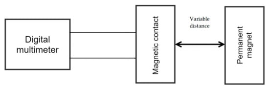 The reliability or correct functionality of the magnetic contacts can be tested according to predefined possibilities, as specified in more detail in the European technical standard with the type designation EN 50131-2-6 [13]. The technical standard prescribes several possibilities, or types of tests where the main one is the resistance of the magnetic field to the external magnetic field generated by the parasitic magnet. In this case, it is determined whether the electric security system correctly evaluates the attempt to disrupt or sabotage the system. In addition to the parasitic magnet test, the technical standard defines other tests, such as the basic detection function test in which the values of closing and opening of the magnetic contact are verified and then compared with those specified by the manufacturer. However, these and other types of tests have one basic disadvantage/disadvantage and therefore, given the possibilities of today’s market, they are relatively strict and do not take into account the possibilities of various commonly available magnets [10,13]. The second mentioned test, or the basic detection function, could be described as a direct verification of the reliability of the magnetic contact. This is because it takes place in a slow, gradual, and simulated movement from the closed position of the magnetic contact, with the magnet facing away from each other, thus determining the actual value of the opening. Subsequently, the whole process is repeated, but in the opposite direction, which determines the value of closing the magnetic contact. The same procedure can be performed in the case of the oblique direction of the permanent magnet, as it should be able to work in all directions of movement. These types of tests are relatively demanding and in many cases even lengthy, which increases the risk of error of the human factor, i.e., the person performing the tests themselves. One of the basic and challenging tasks is to accurately determine the value of individual distances. To avoid errors and inaccuracies in the test, it is recommended that graph paper be used to determine the values better and faster. To know when the magnetic contact closes so that it is activated, it is necessary to connect a signaling device to it. In the absence of a signaling device, it is possible to use a complete installation of an electrical security system with a control panel, with which we can know when the contact was activated [14,15,16,17].