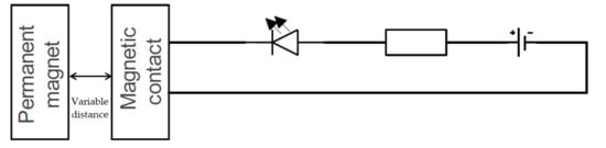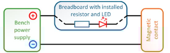 Version 2 consisted of the electrical circuit, as shown in Figure 3, consisting of a laboratory power supply, a Yihua HY1503D, a 560 Ω resistor, and a color LED (red in our case). The output conductors, which were connected directly to the magnetic contact, switched the negative branch of the electrical circuit [23,24].
