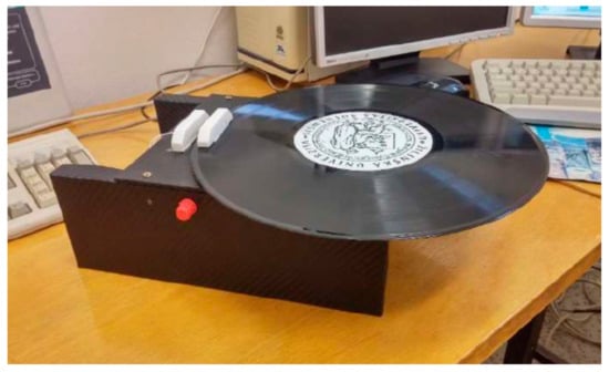 In the case of the second group of measurements, i.e., the lifetime of magnetic contacts, we devised a fully functional device that is protected by the Industrial Property Office as an industrial utility model. The essence of the test device is the possibility of performing a continuous rotary or oscillating movement, the basis of which is a twisting moment formed by a low-speed, motor drive. This was located in the lower part of the test device, together with the other technological part intended to express the number of repetitions, time recording, and the possibility of setting the speed, i.e., the speed of movement. With the help of the test device, it is possible to fully automate the measurement at a predetermined distance. This test device also consisted of two parts: the lower part with an electric motor, and the technical part was a fixed part to which the magnetic contact was attached. The movable part was formed by a plate that rotated around its center in the direction and speed asset. A permanent magnet was installed on its edge at the working distance of the magnetic contact. Ideally, the working distance was set approximately in the middle of the scale specified by the manufacturer or if the actual working distance from previous tests is known. Subsequently, the measurement was performed by successive rotations of the plate, and each time one circuit was performed, the given value was recorded in the internal memory of the device; also in a given number of rotations, the time is determined and whether the magnetic contact has been activated. The recorded data can then be downloaded from the test device to a portable device in the format of a file with the final .xlsx file, which can be edited in MS Excel and the measurement of which can be evaluated. In Figure 5, we can see the test device with the magnetic contact placed before starting the measurement [23,26].