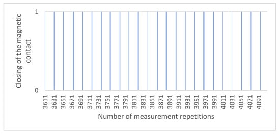 In Figure 6, we can see the step changes indicating the activation of the magnetic contact, where the initial position is 0 and the value 1 means the nonactivation of the magnetic contact in a given turn. The values in the figure do not reflect the duration of activation/non-activation of the magnetic contact; it only reflects the fact that the change has occurred. On the graph, 1 is specifically broken into 448 activations with a value of 0 and 52 nonactivations with a value of 1. The total measurement was 10,000 repetitions, and they lasted approximately two and a half hours.