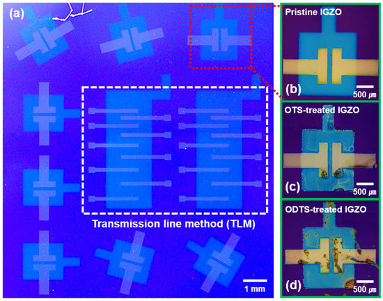 Image of transistor: (a) Optical microscopy image of IGZO TFT designed for experiment; (b) image of pristine TFT; (c) image of IGZO TFT treated with OTS; (d) TFT image with ODTS treatment.