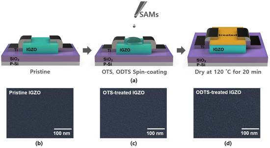 OTS (Sigma-Aldrich St. Louis, MO, USA) and ODTS (Sigma-Aldrich) have additional 8 and 18 carbon chains in trichlorosilane (HCI3Si), respectively. We prepared 5 mL of a 1% v/v solution by mixing OTS and chlorobenzene (C6H5Cl) (Sigma-Aldrich) [26]. Moreover, ODTS was mixed using the same method with a 1% v/v concentration. The solutions were mixed for 6 h at room temperature using a magnetic stirrer. To perform the SAM treatment on top of IGZO surfaces, we applied UV-ozone treatment to the IGZO surface. UV-ozone treatment induces covalent bonding between the IGZO surface and trichlorosilane by forming OH on the IGZO surface. A solution of OTS and ODTS was spin-coated at 3000 rpm for 10 s on the IGZO surface where OH was formed. After the coating was complete, the TFT was dried in air for 20 min on a hot plate at 120 °C [25]. These processes were simply shown in Figure 2a.