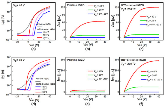Transfer curve based on the annealing temperature of OTS–treated (a) and ODTS–treated transistors (d); Pristine output curve of OTS–treated (b) and ODTS–treated transistors (e); Output curve of OTS–treated (c) and ODTS–treated transistors (f) according to annealing (TA = 200 °C).