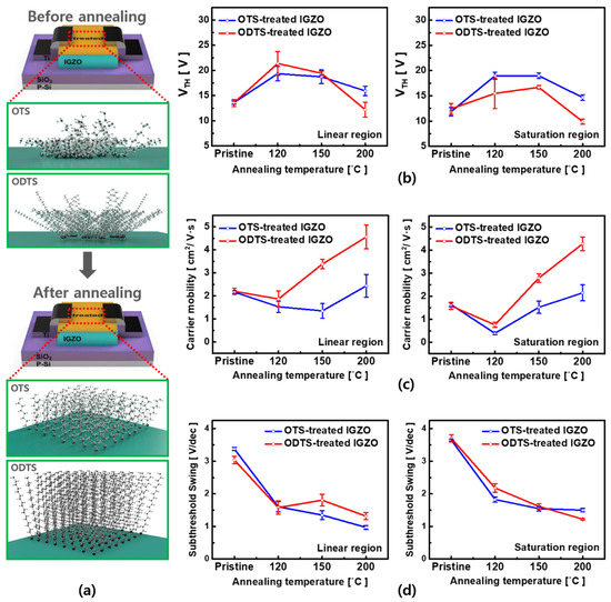 To verify reliability and uniformity of the SAM treatment doping effects, we performed the statistical experiments by measuring 8 devices for each condition. Figure 4b–d show the trend of the device parameters (i.e., VTH, effective carrier mobility, and SS) as a function of TA and the SAM carbon chain length. Interestingly, after the SAM treatment, the OTS and ODTS-treated TFTs, VTH increased, and the on-off current ratio decreased, which can be explained by the following: As the OTS or ODTS combined with Si-O-H, HCl was generated, and HCl still remained at 120 °C, possibly acting as a charge trap [28]. However, after annealing at TA = 200 °C, the dipole formed by the aligned carbon chain reduced VTH and improved the effective carrier mobility. The OTS-treated TFT was 1.3 times increase in effective carrier mobility (1.63–2.14 (cm2/VS), in saturation region). Especially, ODTS-treated TFTs showed 2.5 times larger (2.68–4.27 (cm2/VS), in saturation region) increase in effective carrier mobility compared with the pristine TFT. Through the above results, it was concluded that the doping of the OTS and ODTS treatments was effective.