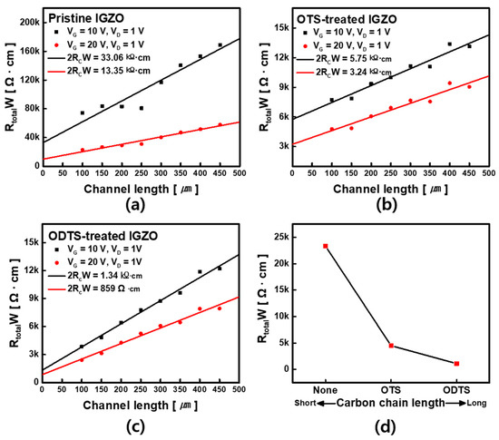 To investigate the doping effects in terms of contact resistance (RC), we used the transfer line method (TLM). Figure 5a shows a huge resistance, observed in the undoped transistor (2RCW = 33.06 kΩ·cm at VG = 10 V; 2RCW = 13.35 kΩ·cm at VG = 20 V). However, OTS- and ODTS-doped transistors provided a lower Rc compared with the counterpart of the pristine TFTs (OTS-treated TFT: 2 RC·W = 5.75 kΩ·cm at VG = 10 V and 2 RC·W = 3.24 kΩ·cm at VG = 20 V, in Figure 5b) (ODTS-treated TFT: 2 RCW = 1.34 kΩ·cm at VG = 10 V and 2 RCW = 859 Ω·cm at VG = 20 V, in Figure 5c). The observed Rc reduction resulted from the thinner Schottky barrier by the dipole effect of the SAM treatment; the SAM bonded to the upper surface of the IGZO, thereby inducing energy band bending by the positive dipole effect, and the contact resistance was reduced due to the thinner Schottky barrier, which is consistent with the results of previous studies [29,30,31]. As a result, ID increased due to the decrease in RC, thereby increasing the on–off current ratio occurring. Figure 5d shows the influence of the transition of the chain length and contact resistance. Based on the above results, it was concluded that RC and the SAM treatment doping are significantly related. The electrical characteristics of the TFTs can be modulated based on the carbon chain length of the trichlorosilane carbon chains with the variable TA.