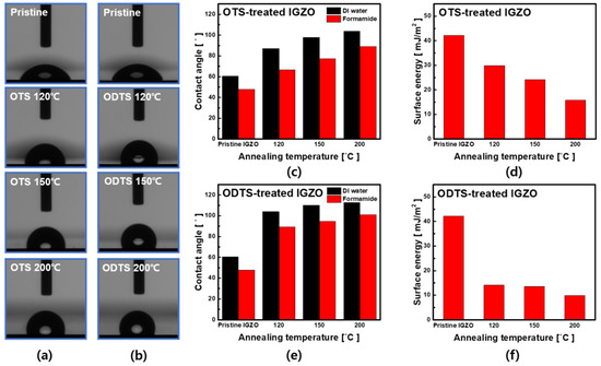 (a,b) The image of change in contact angle at OTS and ODTS. Change of contact angle by (c) OTS, (e) ODTS treatment and annealing. (d), (f) Surface energy according to the change in contact angle of each SAMs. The (c–f) graph is plotted as mean of 5 samples.