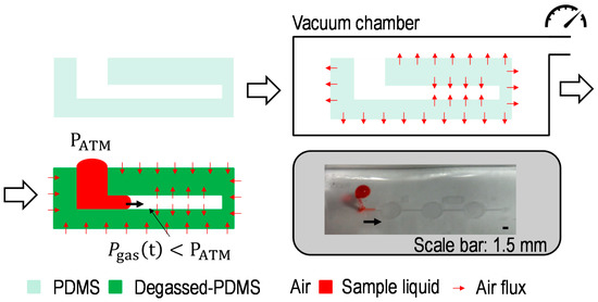 Vacuum-driven pumping has been attracting increased attention as an alternative to passive pumping methods [,,]. Gas-solubility-based vacuum-driven pumping utilizes the gas solubility property of materials (Figure 1). The device is made from materials with good gas solubility is degassed before use. Advantages of the vacuum-driven approach are absence of bubble formation [,,,], high tolerance to surface conditions [,], and robust passive pumping [,]. Vacuum-driven pumping can easily be integrated with other types of pumping without the need for additional peripherals.