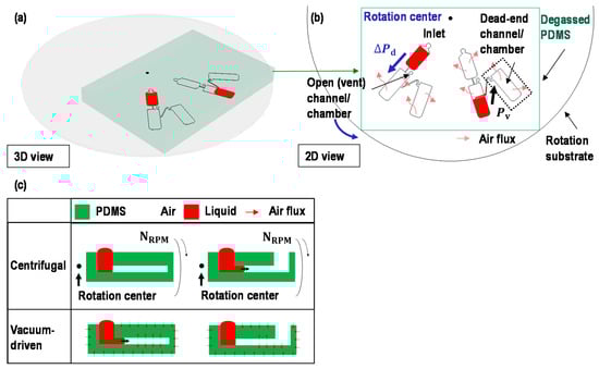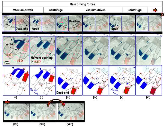Centrifugal force and vacuum-driven force are the two main forces being leveraged in this device, as shown in Figure 2. This is aside from the effects of a Coriolis force and the moment of inertia. The dominant force is switched between the centrifugal force and the vacuum-driven force during device operation. The conditions to trigger centrifugal flows and vacuum-driven flows are compared and illustrated in Figure 2b,c. The centrifugal flows require a spin with a rotational speed and a vent to deliver the liquid sample into the chamber. The vacuum-driven flows require the device made from materials with good gas solubility (e.g., PDMS) to be degassed before operation. Additionally, the chamber should be dead-end to allow liquid sample delivery. For example, in Figure 2b, the sample can be loaded from the top chamber to the bottom chamber, where the vent is open to the air, by applying angular velocity (centrifugal force). Once the sample was transferred to the bottom chamber, the sample from the chamber to the adjacent chamber, there is no opening and considered as a dead-end chamber. Considering the vacuum-driven pumping concept in Figure 2c, the sample would be transferred by vacuum-driven pumping. In short, to drive the sample with a centrifugal force, the target chamber should be open to the air in addition to the angular velocity, while to drive the sample with vacuum-driven force, the target chamber should be close. If wisely designed the device and let the liquid sample go through the open chamber and the close chamber one after another, we can make the situation to drive the sample using the centrifugal force and the vacuum-driven force one after another.