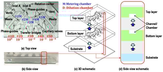 Figure 3 shows the images and schematics of the proposed device for a ten-fold serial dilution. The device has two inlets: inlet A for sample loading and inlet B for buffer loading. There are five sets of metering chambers and dilution chambers corresponding to serial dilutions with concentrations of , and , aside from waste chambers for holding the excess volume of sample and buffer after the metering process. The device has three vents: two vents are in waste chambers, and one vent is in #1D (the ports of other vents in #2D, #3D, and #4D are not punched in this study). First, metering chambers are designed to allocate 8.96 μL in #1 M; 8.07 μL each in #2M, #3M, and #4M; and 7.26 μL in #5M. Dilution chambers are constructed with the aim of having a series of ten-fold serial dilutions ranging from . The device is composed of three layers: a PDMS top layer, a PDMS bottom layer, and a glass slide substrate. The bottom layer possesses a symmetric design concerning the top layer to possess sufficient chamber height for efficient mixing and relatively large sample volumes (~7 to ~10 μL). A single layer of PDMS microfluidic channel/chamber with a glass slide substrate may work as well; however, it is not easy to keep uniform, especially concerning the depth of chambers of a few hundred micrometers scale. The fabrication process will be discussed later. However, making thick chambers in a single layer of PDMS using the soft lithography process is not easy and can be subject to the edge bead effect [], resulting in a non-uniform depth.