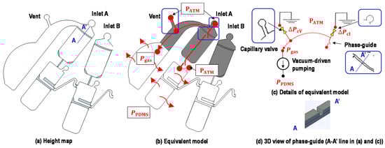 A height map and equivalent model for the vacuum-driven metering process. (a) Colored parts were designed to have , while non-colored parts were designed to have . Along with lateral geometrical confinements, the height differences assist in determining the fluidic passage (such as liquid sample stop, split, confinement, etc.). (b) Equivalent model and (c) details of equivalent model. Colored parts represent the liquid filling parts before the metering. The pressure difference across the liquid column is generated due to the gas solubility of degassed PDMS, driving liquids into the dead-end channel/chamber. Geometrical confinement by phase-guide structures would play a role in metering the liquids. is the atmospheric pressure, is the pressure inside the chamber, is the pressure associated with degassed PDMS, and and are the capillary pressure of the capillary valves at the vent and the inlet, respectively. (d) 3D schematic view of phase-guide for one side of a PDMS layer.