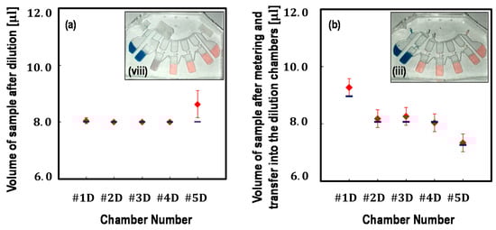 Volume analysis: (a) the measured volumes of liquids in each chamber after serial dilution (shown in Figure 4viii,viii’) and (b) the measured volumes of liquids in each chamber after metering and transfer into each dilution chamber (as shown in Figure 4iii). Digital micropipette aspiration was used to measure the sample volume. More than four test devices were used for measuring for (a) and (b), respectively. The insets indicate in which process the samples were collected for measuring.