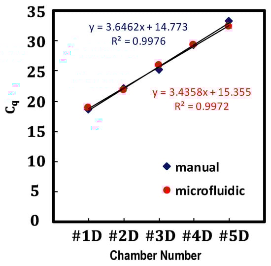 Although fluorescent analysis is widely used for serial dilution analysis, there are limitations in detecting a wide range of concentrations due to background noises [,]. As an alternative, a qPCR assay can be used to verify the performance of the serial dilution because it provides an unusually large dynamic range across several orders of magnitude. For proof of concept, in this study, qPCR was performed after preparing a series of ten-fold serial dilutions of the cDNA sample using a device as previously described, as well as by manual pipetting. The measurement of each concentration point was performed in triplicate. Figure 7 shows plots of the measured cycle quantification values, , against the concentrations of serially diluted cDNA sample obtained by using the proposed microfluidic device and manual pipetting. Here, is a PCR thermal cycle number at which the reaction curve intersects with a threshold line, such as background fluorescence [], and the values show a linear relationship with the sample concentration across several orders of magnitude. The result showed a strong linear relationship between the values and the ten-fold serial dilutions of cDNA sample ranging from to , with obtained using the line of best-fit, which was equivalent to that for the cDNA sample prepared by manual pipetting. The slope of the microfluidic results is not as sharp as the one from the manual results. Some of the possible reasons are that; the volume of cDNA and buffer were not accurate (e.g., larger) compared with what we expected in this qPCR test as well, considering the volume analysis results in Figure 5, insufficient mixing, etc. resulting the deviation. To ensure the validity, repeating the qPCR tests to add error bars are needed in the future study.