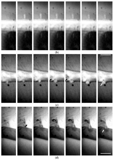 The water tank had two viewing glass windows with a diameter of 90 mm for photography during the experiment. The lesion formation in the BSA gel phantom, the rupture of the artery, the dynamics of the induced bubble, and its interaction with the artery wall were recorded using a high-speed camera (Fastcam 1024PCI, Photron, San Diego, CA, USA) with a magnification lens (Optem Zoom 70Xl 7:1 micro-inspection zoom lens system, Qioptiq Photonics GmbH, Munich, Germany) at a resolution of 1024 by 1024 pixels at a frame rate of 600 Hz. A 2000 W light (LX601GS, Unomat GmbH, Reutlingen, Germany) was used as the illumination during the photography. A transistor–transistor logic (TTL) pulse from a digital delay generator (DG535, Stanford Research Systems, Sunnyvale, CA, USA) was used to synchronize the photography with HIFU ablation. Each frame could be extracted from the captured videos using software (FASTCAM viewer program, Photron) for analysis. At most, two seconds of capturing were available because of the limited memory in the high-speed camera.