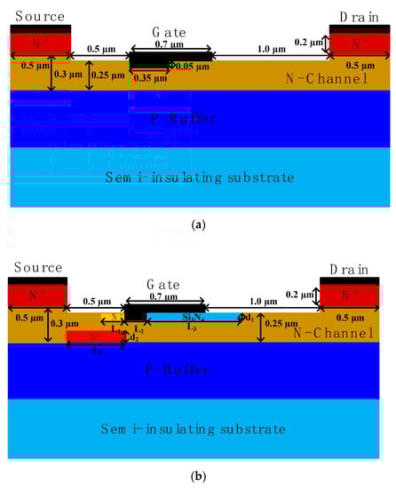 In addition, since the depletion layer isolates the carriers from the surface of the device during the operation of the MESFETs, the surface of the device has a relatively small effect on the carriers. Therefore, compared with the MOSFETs, the MESFETs have higher saturated electron mobility, higher current, greater transconductance and transmission frequency []. Therefore, the application of 4H-SiC MESFET in the fields of high temperature, high voltage, high frequency and high power has received extensive attention. How to improve the performance of 4H-SiC MESFET has become a challenge. Methods such as adding field plates [], improving gate structure [,,] and improving channel structure [,,,] have been used to improve the performance of devices. With the continuous reduction in device size, the requirements of device design for power consumption and efficiency become increasingly higher. In recent years, how to improve the PAE of devices without significantly sacrificing DC and AC characteristics has gradually become an important topic [,,].