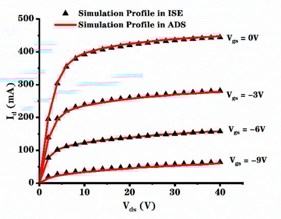 Two-dimensional numerical simulation of these structures was carried out by ISE-TCAD software. As the process of SiC material in ADS software is not perfect at present, while the process of GaAs material is mature, we fit the model of SiC MESFET by modifying the model parameters of GaAs MESFET, so that it could better reflect the trend of power added efficiency of devices. After the device model is established, it needs to be verified, and the “ads_templates: FET_curve_tracer” module in ADS was used to measure its IV characteristics; the measurement results were compared with those in ISE-TCAD. The results are shown in Figure 2. It can be seen that the IV characteristic curve of devices in ADS is in good agreement with that in ISE-TCAD. Therefore, we used the EE_FET3 model of nonlinear GaAsFET model in ADS, modified the existing model according to the data obtained from simulation and used “Load Pull-PAE, Output Power Contours” in Power Amplifier Examples to measure the power added efficiency [].