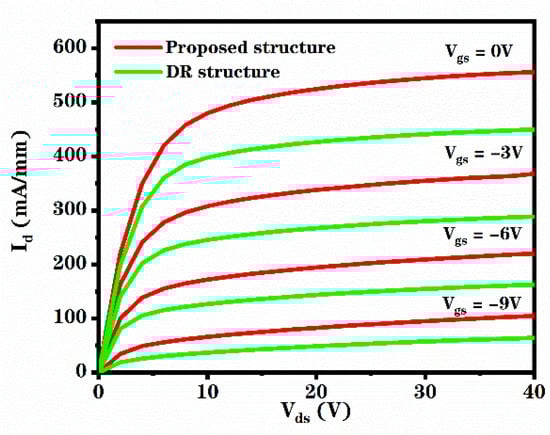 Evolution of drain current (Id)as a function of drain-source voltage (Vds) for the proposed structure and DR structure.