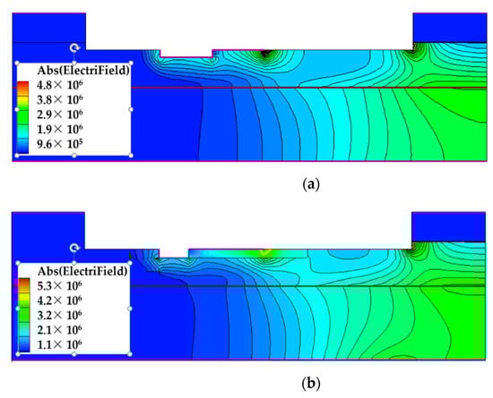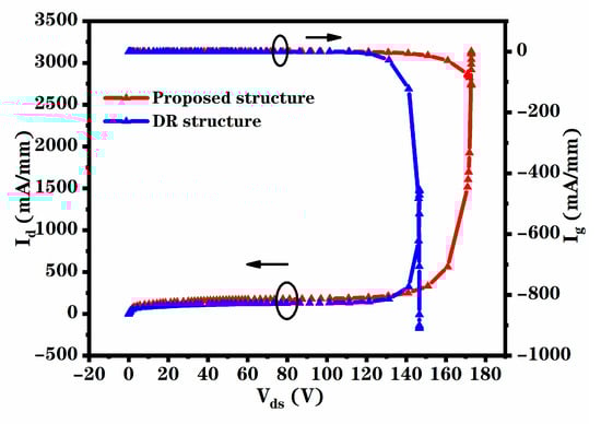 Breakdown voltage is an important parameter for MESFET devices, which limits Pmax and applications of the devices. Figure 4 shows the breakdown performance of the two structures under the condition of Vgs = Vt. The variation of drain current and gate current (Ig) with the increase in Vds is shown in the figure. Studies show that breakdown is caused by the accumulation of the electric field of the device []. With the increase in Vds, the maximum electric field increases continuously, which makes the carriers accelerate and collide with each other seriously. Finally, the device is broken down due to the large increase in carriers []. It can be found that the breakdown performance of the novel structure is better in contrast with the DR structure, because the insulation region improves the electric field distribution in the device, as shown in Figure 5.