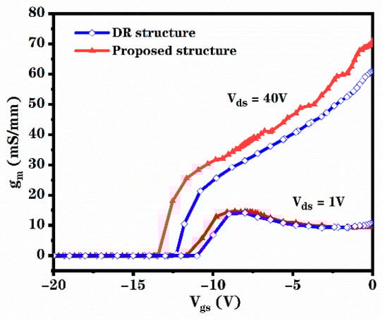 Relationship between gm and Vgs for the proposed structure and DR structure at Vds = 40 V and Vds = 1V.