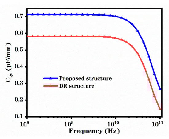 The gate-source capacitance (Cgs) is a significant parameter closely related to the AC characteristics. Additionally, the reduction in the Cgs can increase the fT of the device. Under the condition of Vds = 40 V and Vgs = 0 V, the relationship between Cgs and frequency of DR structure and novel structure is shown in Figure 7. As can be seen, the Cgs of the novel structure increases by 22% compared to the DR structure. The cut-off frequency is given by the following formula []: