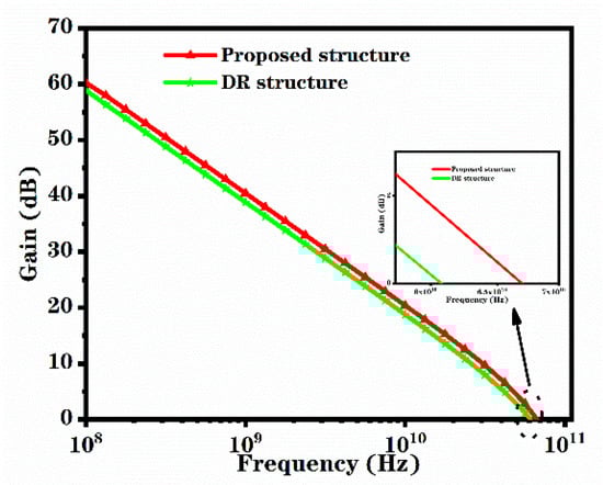 Figure 8 shows the relationship between the simulated unilateral power gain and frequency of the two structures under the conditions of Vgs = 0 V and Vds = 40 V. The maximum oscillation frequency is considered to be the frequency when the gain is zero. The fmax of the novel structure is 66.9 GHz, while the fmax of the DR structure is 60.5GHz. The formula for calculating the maximum oscillation frequency is as follows []:
