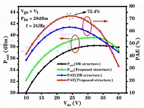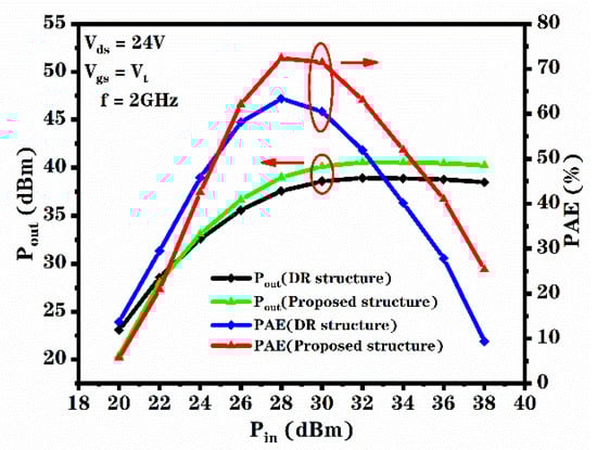 where Pout is alternating current output power, Pin is alternating current input power and Pdc is direct current input power. The PAE versus the Vds for the novel structure and DR structure is shown in Figure 9. It can be seen that the PAE curve of the novel structure is mostly above the PAE curve of the DR structure. Additionally, the PAE versus the RF input power for the DR structure and novel structure is shown in Figure 9. It can be seen that with the increase in the amplitude of the input signal, the amplifier enters the saturation state, and the output power begins to saturate, while the PAE and gain decrease. Therefore, with the increase in input power, the output power is finally saturated, which reduces the gain and the PAE []. From Figure 9 and Figure 10, we calculated that the maximum PAE of the novel structure increased by 14% to 72.4% due to the increase in transconductance, compared to the DR structure. As the transconductance of the device increases, the AC gain of the device, the AC output voltage and the AC output current of the device increase, the AC output power of the device increases. In addition, the increase in transconductance makes the DC working current of the device increase and the DC input power of the device increase. However, the influence of increasing transconductance on the AC output power is higher than that on the DC input power. Therefore, the increase in the transconductance of the device increases the PAE of the device.