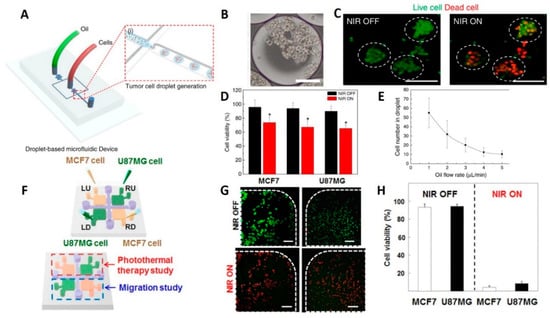 - Lee, J.M.; Choi, J.W.; Ahrberg, C.D.; Choi, H.W.; Ha, J.H.; Mun, S.G.; Mo, S.J.; Chung, B.G. Generation of tumor spheroids using a droplet-based microfluidic device for photothermal therapy. Microsyst. Nanoeng. 2020, 6, 1–10. [Google Scholar] [CrossRef]
