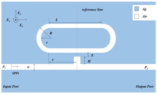 Figure 1 represents the graphical illustration of the proposed sensor design comprising a racetrack ring resonator coupled with a MIM bus waveguide with a stub. Here, we used the 2D model to replace the 3D one, which can simplify the calculation. If the structure height is larger than the skin depth of SPPs (in real photonic devices, the structure height is larger than the skin depth of SPPs), the role of structure height in the losses of the 3D model can be approximated by a 2D model [30,31]. The material losses have a minute variation as the height of the waveguide is greater than 200 nm, which shows that the height of the waveguide does not affect material losses after a certain value. Even if the height of the waveguide approaches infinity, the material losses stay the same, which is the case of a 2D simulation [32]. The blue and white parts represent the Ag layer and air ( = 1), respectively. The transmission spectra were obtained by the numerical FEM, and the dieletric of Ag can be expressed using the Debye–Drude dispersion model:
