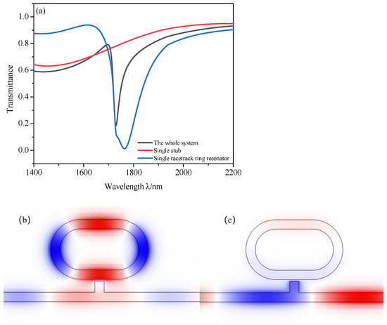 (a) Transmission spectra of the whole system, single stub and single racetrack ring resonator; (b,c) the magnetic field distribution HZ at λ = 1729 and 2000 nm, respectively.