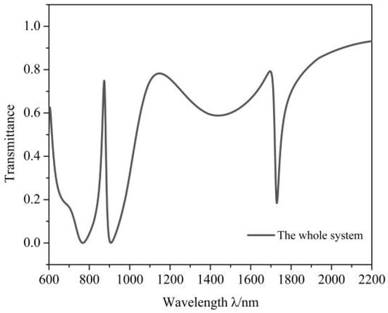 To understand the transmission properties of the designed structure, firstly, the whole system, single stub and single racetrack ring resonator were compared. We fixed the initial structural parameters as L = 200 nm, h = 100 nm, R = 140 nm, r = 90 nm, g = 10 nm, x = 100 nm. The results are plotted in Figure 2 and the transmittance T = P2/P1 [38].