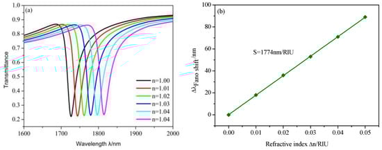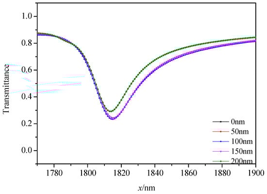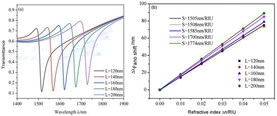 Subsequently, the effects of geometric parameters of the design on sensing performance were studied. The length of the racetrack ring resonator L is discussed first. The value of L changes from 120 to 200 nm at intervals of 20 nm and other values are set as default values when n = 1, whose results are shown in Figure 7. The resonance dip shows an obvious redshift with an increasing L, as depicted in Figure 7a, which can be explained by Equation (2): when L increases, the propagation length of SPPs in the Fano resonance cavity will increase, which will cause the value of to increase. Moreover, it is clear that with increasing L the transmittance increases, but the S of the design will increase from 1505 to 1774 nm/RIU when L increases from 120 to 200 nm, as plotted in Figure 7b.