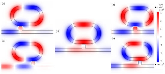 Furthermore, the normalized HZ field of these structures was analyzed, as plotted in Figure 5. We can clearly observe in Figure 5 that when the displacement (x) of the ring from the stub was changed, the symmetry axes of the normalized HZ field of these structures rotated around the center point of the system. Especially, when x = 100 nm, the near-field intensity pattern strongly localized at the racetrack ring resonator with respect to HZ at other structures, which can be seen from the effectively localized magnetic field. The discrepancy of the resonance dip at a different transmittance is due to the different coupling position where different interferences of near-field coupling effect [40] and phase coupling effect [40] occur between the incident SPPs and the racetrack ring resonator. According to the above analysis, we can see that we can change x to obtain different transmittances and a normalized HZ field. Hence, we chose an x = 100 nm structure to study in this paper.